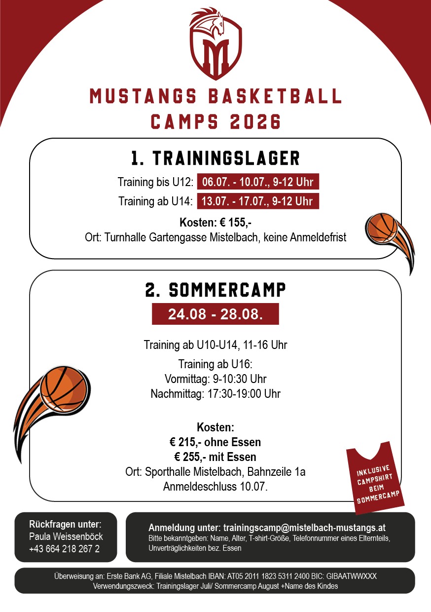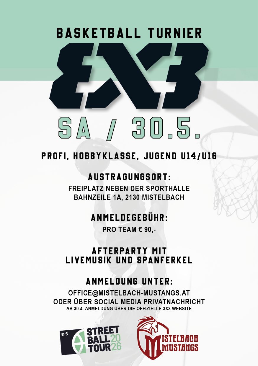 Sehr geehrte Damen und Herren, liebe Basketballvereine, der Verein Mistelbach Mustangs freut sich, Sie und Ihre Teams herzlich zu unserem 3x3 Basketball Turnier in Mistelbach einzuladen. Datum: Samstag, 30. Mai 2026 Austragungsort: Freiplatz neben der Sporthalle, Bahnzeile 1A, 2130 Mistelbach Das Turnier wird in folgenden Kategorien ausgetragen: • Profi • Hobby • Jugend (U14/U16) Nenngeld: € 90,- pro Team Neben spannenden Spielen werden die Teilnehmerinnen